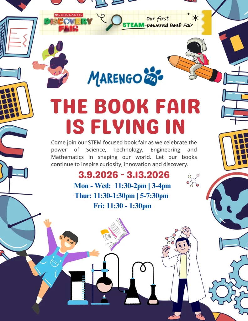Save the date for a “STEAM Discovery Fair” Book Fair in the auditorium from March 9th-March13th after school. Or shop online at Scholastic. Every purchase benefits our school.