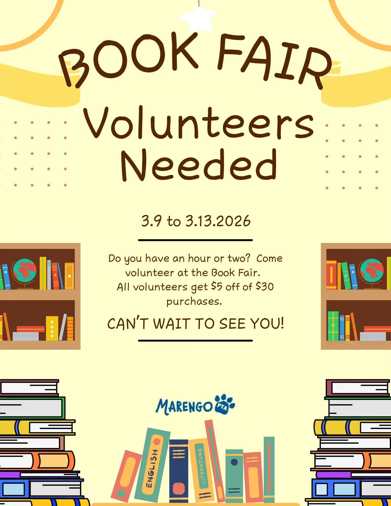 All volunteers get $5 Off $30 Book Fair purchases!